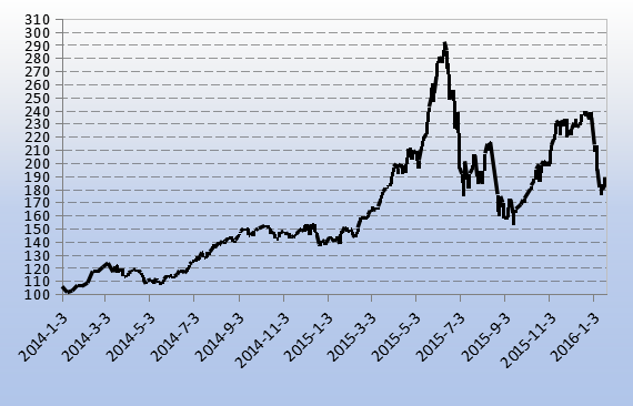 进入2016年以后,受上证大盘影响,股价指数也是一路走低,从5243点一度下跌至3935点,跌幅达25个百分点,近日稍有提振小幅回升。目前,国内锂离子电池受锂盐大涨影响,产品价格也被迫走高,对于股价上涨的重要概念——新能源汽车来说是一个坏消息,2016年新能源车的产销量能否继续高增长将成为影响电池股价的关键因素。
