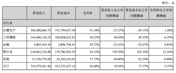 雅化集团表示,公司在民爆行业整体业绩大幅下滑的背景下,实现经营业绩逆势增长的好成绩,主要基于三大方面的重要举措:第一,雅化集团大力推进生产装备智能化应用,通过技术改造,集团现有生产线装备智能化水平得到有效提升,生产过程基本实现无(少)人化,大大降低了在线用工人数,使产品生产成本大幅降低;第二,雅化集团成功推行营销转型,主要业务模式已从“传统的产品销售为主导”转化为“以爆破业务和一体化服务为主导”,面向终端、实施全方位、多维度的营销策略;第三,在做强做大民爆主业的同时,雅化集团不断加大对新产业的开发与拓展,军工产业和锂产业等方面取得了较好的成效,为该公司整体业绩的持续提升打下了较好的基础。