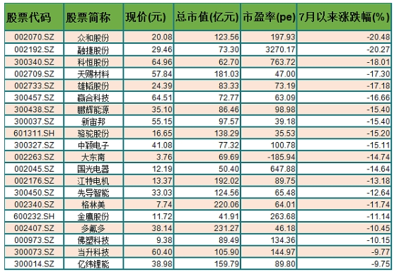 7月以来跌幅最大的20只锂电股