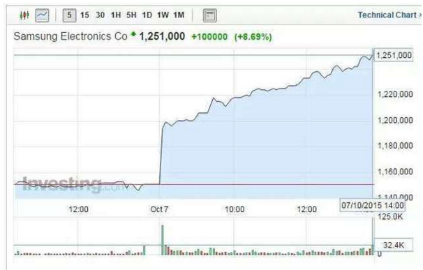 可让人惊讶的是,三星电子在首尔收盘昨日(7日)涨8.69%,创2009年来最大涨幅,股价报125.1万韩元,创7月30日以来新高;6日更是早盘一度跳涨5%,触及历史新高!