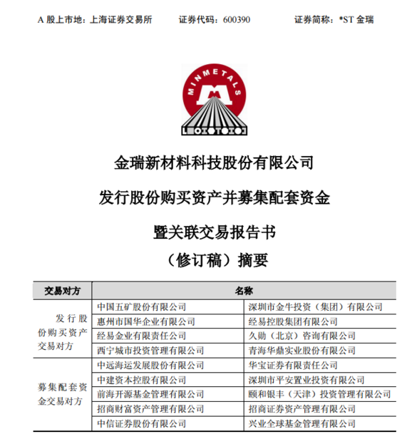 *ST金瑞(600390)12月11日晚间发布公告称,公司拟向间接控股股东五矿股份发行股份购买五矿资本100%股权,作价178亿。并向金牛投资和惠州国华发行股份购买五矿证券2.79%和0.61%股权,向经易控股、经易金业和久勋咨询发行股份购买五矿经易期货4.9%、4.4%和1.06%股权,向西宁城投和青海华鼎发行股份购买其分别持有的五矿信托1.8%和0.06%股权。