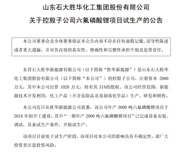 石大胜华(603026)12月19日晚公告,公司近日从控股子公司胜华新能源公司获悉,该公司年产5000吨六氟磷酸锂项目于2016年初开工建设,其中“一期年产2000吨六氟磷酸锂项目”已完成设备安装、调试,具备试生产条件,开始试生产。