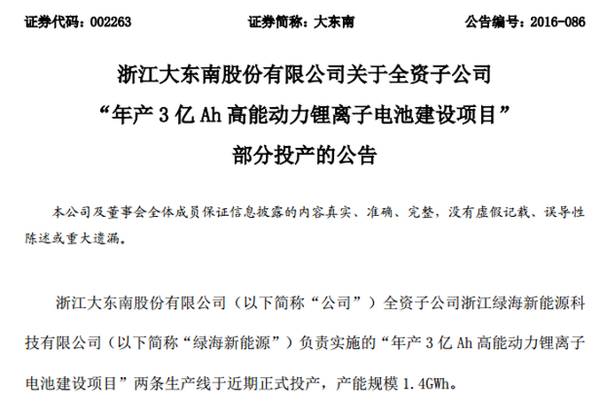 大东南(002263)12月21日晚间公告,全资子公司绿海新能源负责实施的“年产3亿Ah高能动力锂离子电池建设项目”两条生产线于近期正式投产,产能规模1.4GWh。