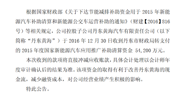 曙光股份晚间发布公告,公司控股子公司丹东黄海12月30日收到丹东市财政局转支付的2015年度国家新能源汽车应用推广补助清算资金5.42亿元。
