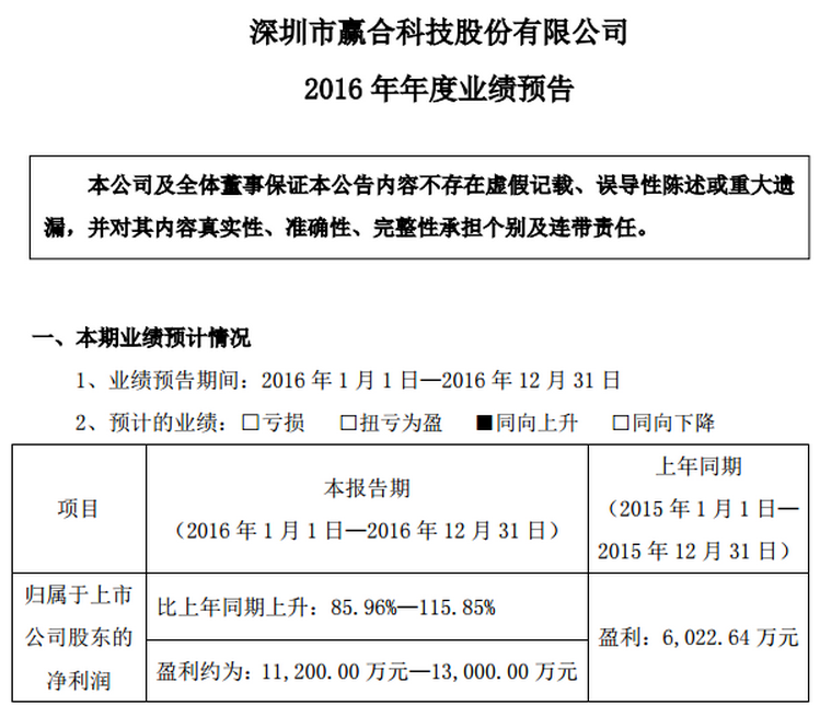 赢合科技(300457)1月12日发布2016年度业绩预告,报告期内归属于上市公司股东净利润为1.12-1.3亿元,同比增长85.96%-115.85%。