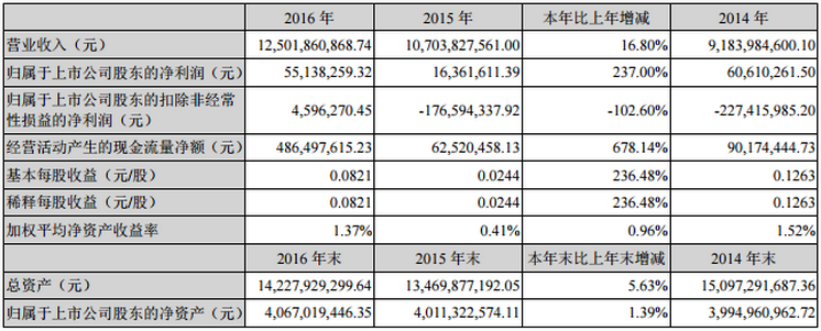 2月27日,天原集团(002386)发布2016年年报,公司2016年1-12月实现营业收入125.02亿元,同比增长16.8%,基础化学行业营业平均收入增长率为-9.31%;归属于上市公司股东的净利润5513.83万元,同比增长237%,基础化学行业平均净利润增长率为24.06%。