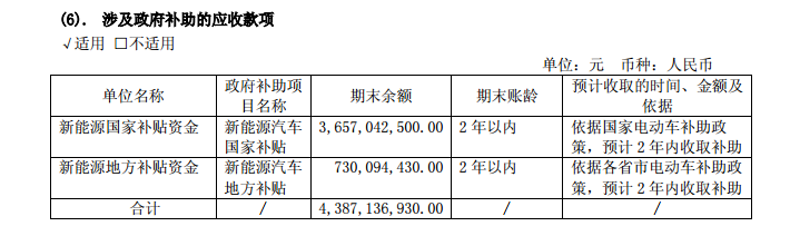 在新能源汽车补贴方面,报告显示新能源汽车国家和地方补贴应收款总计43.87亿元。其中新能源汽车国家补贴,2016年末余额36.57亿元;新能源汽车地方补贴,2016年末余额7.3亿元,期末账龄为2年以内。