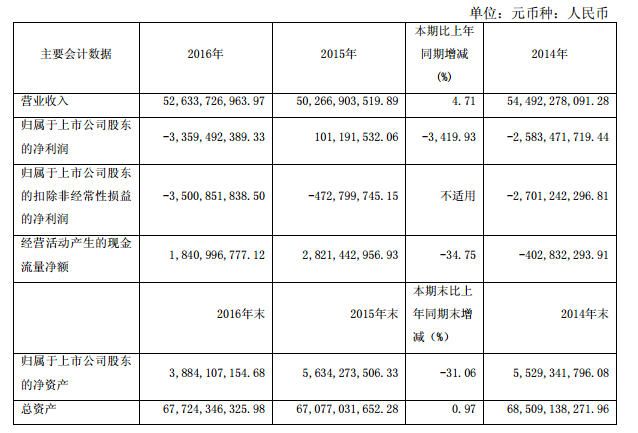 云天化(600096)近日发布2016年年度报告披露,2016年公司实现营业收入526亿元,同比增加4.69%,实现利润总额-34.57亿元,同比减少37.25亿元。