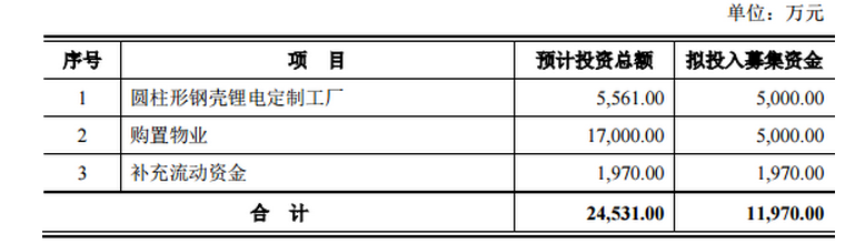 本次丰江电池募集资金1.97亿元,其中,5000万将用于圆柱形钢壳锂电定制工厂项目,5000万用于购置物业,1970万用于补充流动资金。