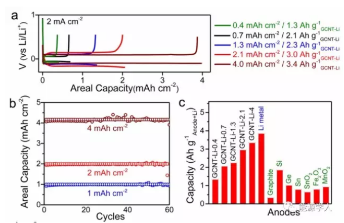 首先,GCNT具有较低的质量贡献率、厚度和较大的比表面积,使得Li能够进入GCNT的深层,从而提高体积的利用率,这也是GCNT-Li具有高面积容量的基础;
