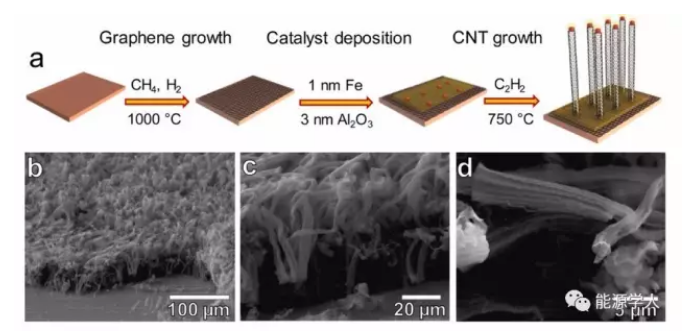 图1. GCNT的生长示意图和结构特征。(a)GCNT生长示意图,电子束沉积1nm铁纳米颗粒是不连续的,并且它们用作CNT生长的催化剂,而3nm的氧化铝层为垂直尖端生长提供支撑。(b-d) GCNT的SEM图像,显示从石墨烯覆盖的Cu基底垂直生长的CNT地毯。