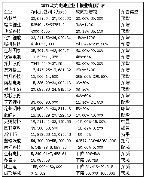 亿纬锂能、猛狮科技、东方精工、当升科技、坚瑞沃能五家企业,净利润同比增长上限超过100%,其中坚瑞沃能在上年同期亏损127.87万元的“底色”下,今年扭亏为盈实现净利润5.47-5.52亿元。公司业绩变动的主要原因是完成收购沃特玛,收入和利润规模大且大幅增加所致。沃特玛2017年上半年实现营业收入约60亿元,净利润约6.1亿元。公司预计非经常性损益对归属于上市公司股东的净利润影响金额约为1,200.00万元。