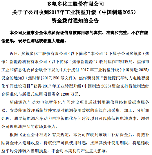 今天(8月10日),多氟多发布公告称,近日,公司下属子公司多氟多(焦作)新能源科技有限公司(以下简称“焦作新能源”)收到焦作市财政局、焦作市工业和信息化委员会联合下发的《关于拨付2017年工业转型升级(中国制造2025)资金的通知》(焦财预[2017]250号文件),焦作新能源“新能源汽车动力电池智能化车间建设项目”获得2017年工业转型升级(中国制造2025)资金支持智能制造综合标准化与新模式应用项目资金1200万元。