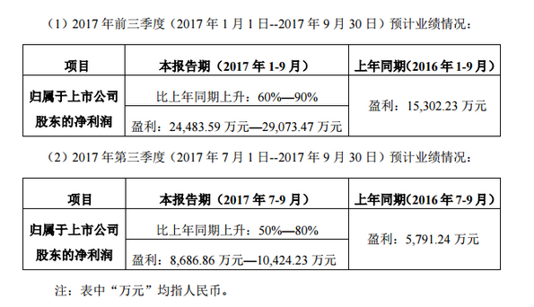 先导智能近日披露前三季度业绩预告显示,2017年1~9月归属于上市公司股东的净利润为24,483.59万元~29,073.47万元,较上年同期增长60%~90%。其中,第三季度归属于上市公司股东的净利润为8,686.86万元~10,424.23万元,较上年同期增长50%~80%。