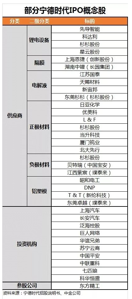 宁德时代上市后,哪些个股将会受益?天风证券表示,参照招股说明书,设备类、正极材料和结构件的单一公司采购金额较大。假设2020年宁德时代出货量为50GWh(其中磷酸铁锂电池10GWh,三元电池40GWh),其对三元正极材料需求有可能超过150亿,结构件的需求约为50亿,而电解液、湿法隔膜的需求约为30亿,磷酸铁锂需求约为20亿。受益企业包含杉杉股份、长园集团、璞泰来、天赐材料、江苏国泰等。