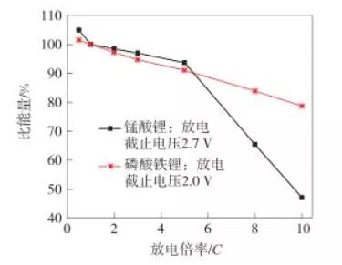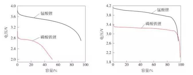 在能量密度方面,锰酸锂和磷酸铁锂一直以来不相上下,克容量上磷酸铁锂会高一些,但是电压较低,两相抵消基本打平,不过,由于锰酸锂的压实密度明显高于磷酸铁锂,就体积比能量来看锰酸锂还是远高于磷酸铁锂的。另外,磷酸铁锂在高倍率放电时能量密度损失较小,性能明显优于锰酸锂。