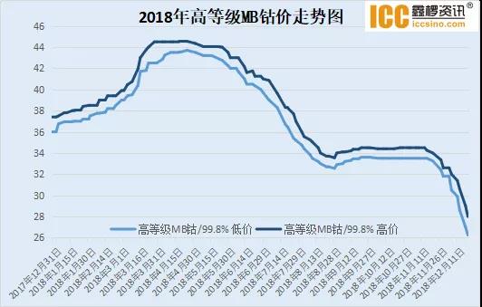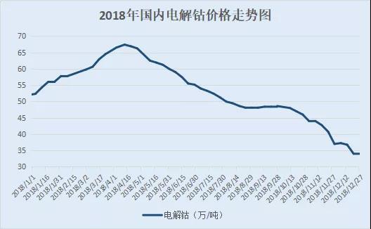 随着供需格局的扭转,钴价在2018年4月份开始转入下行通道。然而,经过大半年的回调行情之后,钴价的下跌行情依旧未能止步。截止2018年年末,国内电解钴价格已经跌至34万/吨附近,仅为年内高价的二分之一。国外钴价在近期更是呈现出加速回落的趋势,12月份累计跌幅超过20%。