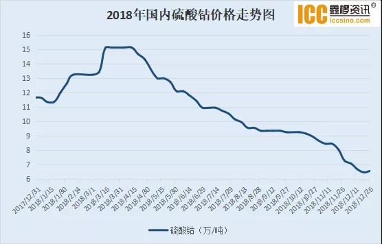 受金属原材料价格下滑的影响,近几个月来硫酸钴价格也一路跟跌,下滑至7万/吨以下。然而在12月底钴价跌势未改的情况下,硫酸钴价格却走出了小幅回升的行情。当前市场上硫酸钴价格报在6.6万/吨附近,较此前低位回升了0.1-0.2万/吨。