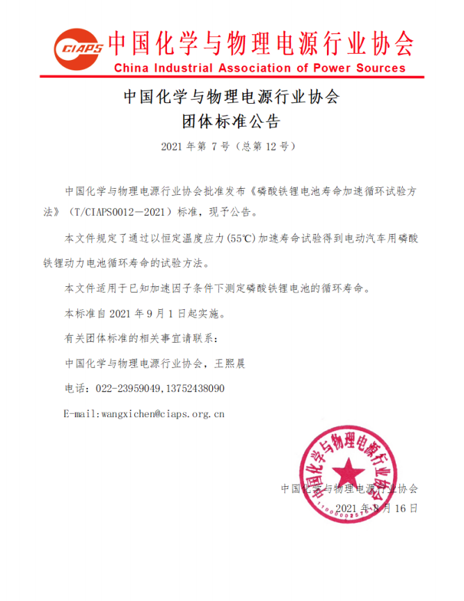 中国化学与物理电源行业协会批准发布《磷酸铁锂电池寿命加速循环试验方法》(T/CIAPS0012―2021)标准,现予公告。
