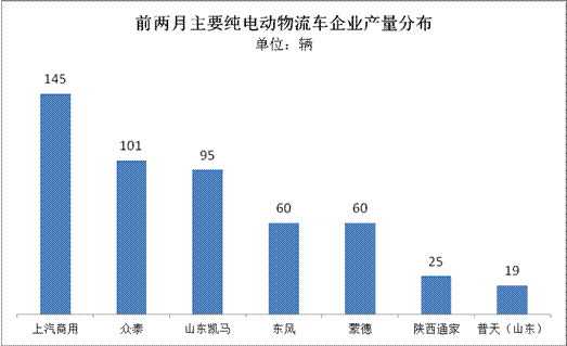 分车企看,前两月纯电动物流车有产量的企业达20家,其中产量仅1辆的车企就达9家,而对应产量超过10辆的车企仅7家。超过百辆的车企仅2家:上汽商用车和众泰;两家产量总计达246辆,占据前两月纯电动物流车总产量的46%。