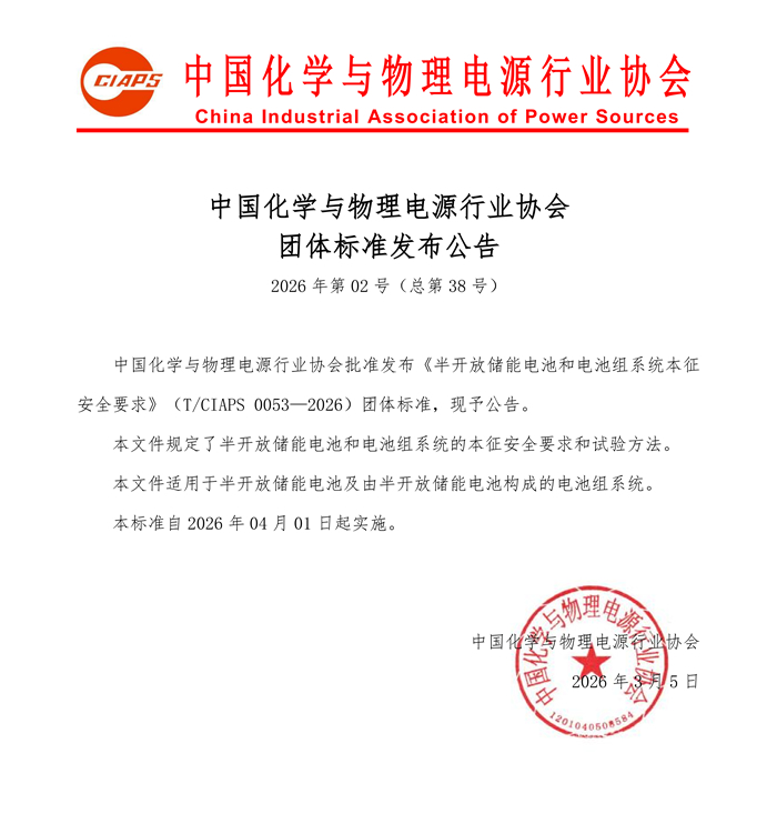 中国化学与物理电源行业协会批准发布《半开放储能电池和电池组系统本征安全要求》(T/CIAPS 0053—2026)团体标准,现予公告。