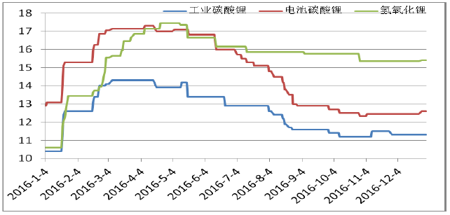 据悉,2016年上半年,锂盐企业效益普遍大幅度增长。由于国内外锂资源开发进度没有达到预期,加之对锂盐的需求快速增加,碳酸锂、氢氧化锂以及金属锂价格大幅度上涨,4月上旬,电池碳酸锂价格达到历史最高价接近18万元/吨,而氢氧化锂主要用于锂基润滑脂、锂离子电池材料等领域,由于产能及生产成本等原因,4月上旬,电池级氢氧化锂价格达到历史最高价19万元/吨。5月中旬后,价格逐渐回落,直到2017年初价格一直在15.2-15.4万元/吨。