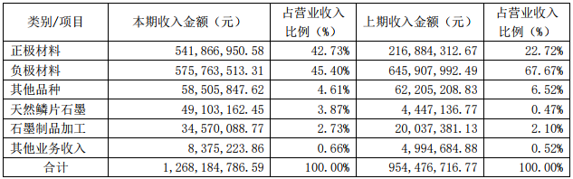 通过收入构成分析发现,贝特瑞正极材料收入金额5.41亿,同比增长149.8%,负极材料收入金额5.75亿,同比下滑10.9%,正极材料收入占比大幅上升、负极收入占比有所降低。对此,贝特瑞表示,主要原因系正极材料销售增长幅度高于负极材料增长幅度,而公司正极材料产能在上半年得到充分释放所致。